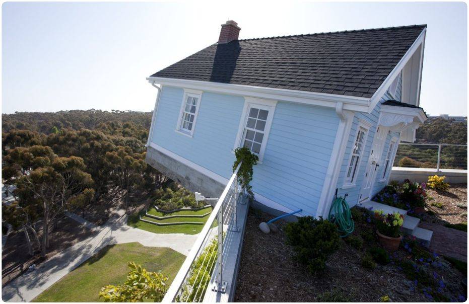 Речь идет о доме, перевернутом в прямом смысле слова. Что снаружи, что внутри все повернуто на 180 градусов: мебель приделана к потолку, из пола торчат светильники, телевизоры прикручены наоборот и даже окна зашторены вверх ногами. Примечательно, что в таком доме моментально теряется ориентация — у посетителей вскоре начинает кружиться голова. Для того, чтобы люди не сошли с ума и поддерживали себя в тонусе, по всему полу (или потолку?) расставлены стаканы с водой.