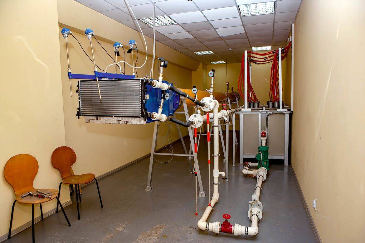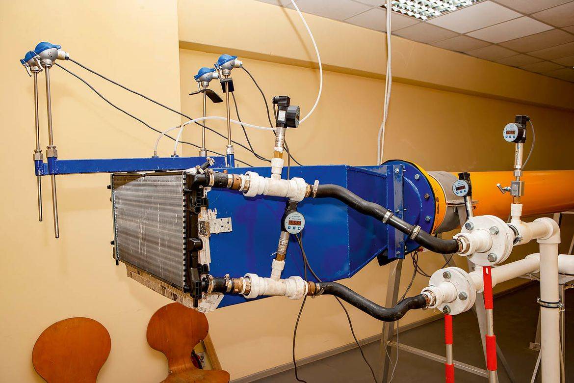 Первое, что обращает на себя внимание, — это длинная (7,5 м) аэродинамическая труба, в конце которой установлен электровентилятор мощностью 50 кВт. Его задача — создание регулируемого воздушного потока (имитация движения автомобиля), который проходит через установленный перед аэродинамической трубой радиатор