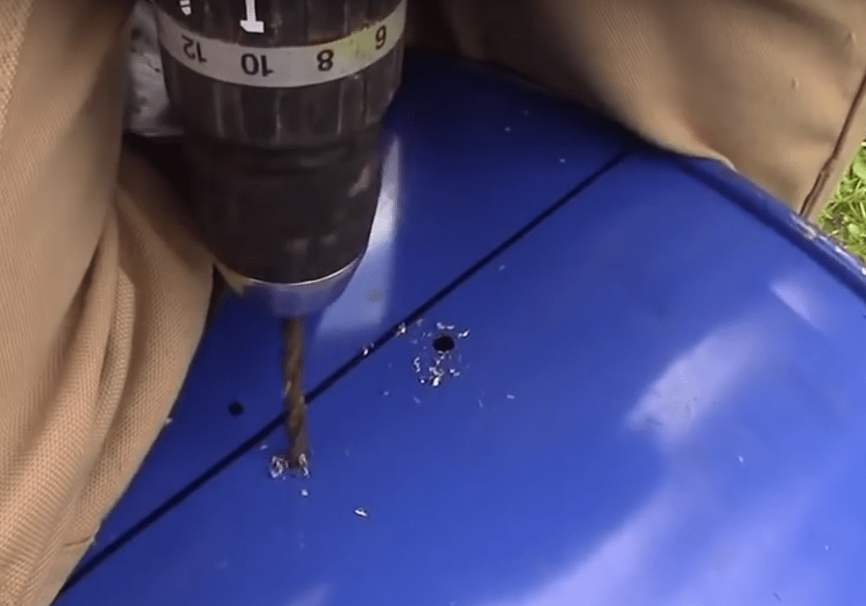 Для создания тяги и циркуляции воздуха в боковых частях бочки необходимо сделать отверстия с помощью электрической дрели. Крышку также можно продырявить, если в будущем в планы входит использовать конструкцию в качестве коптильни.