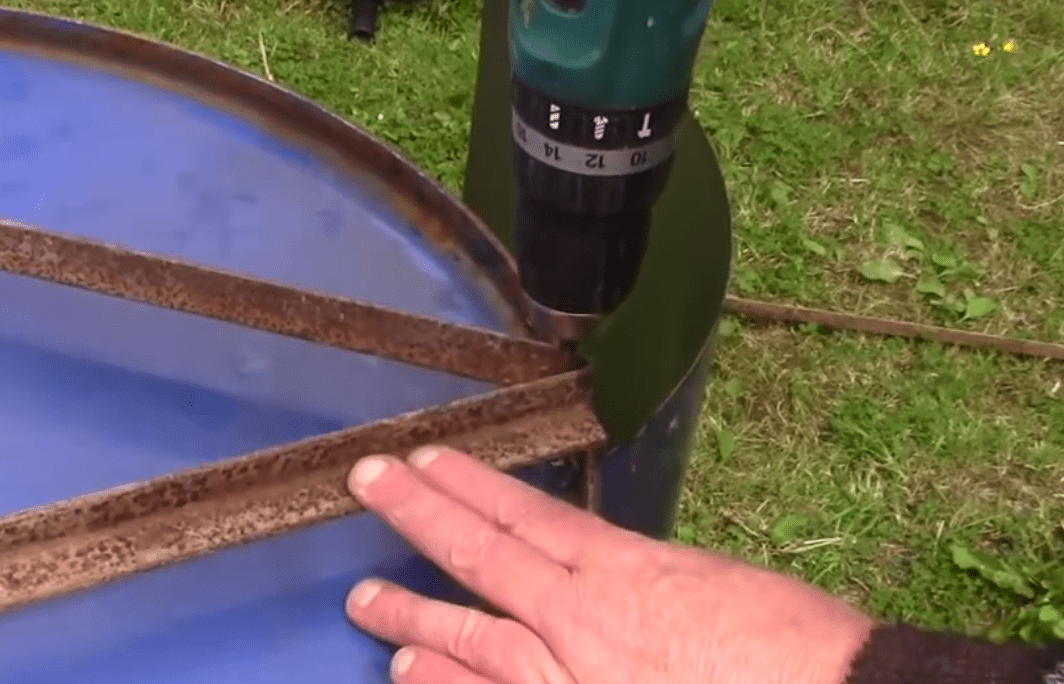 Чтобы прикрепить ножки к бочке укладываем как показано на фотографии и просверливаем 8 мм сверлом 3 дырки. Одна сверху и две по бокам барбекю. Не забывайте, у вас должны быть 8 мм болты.