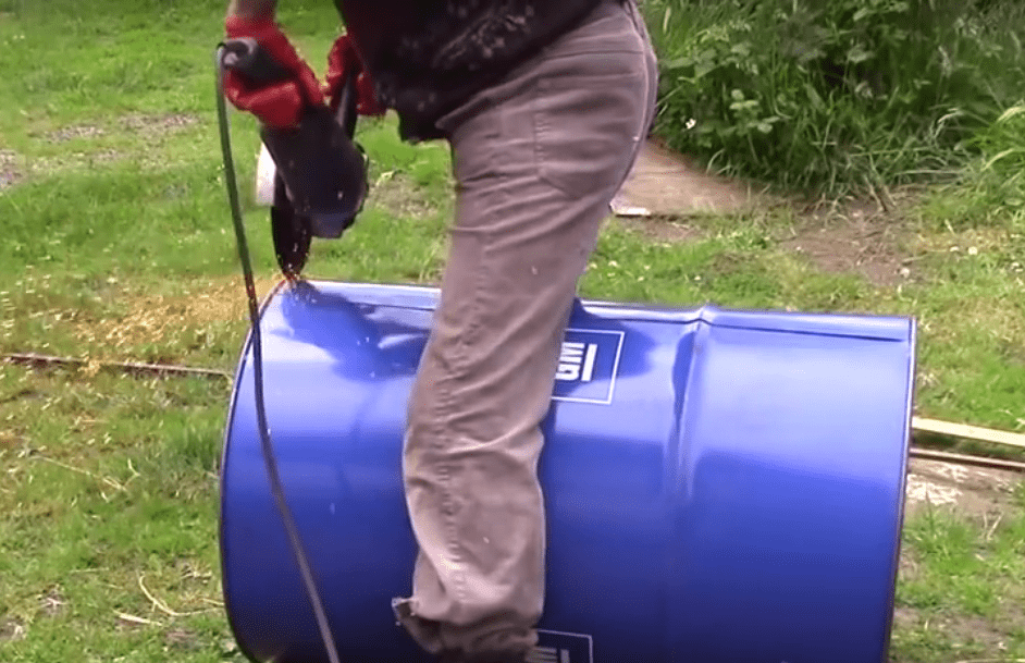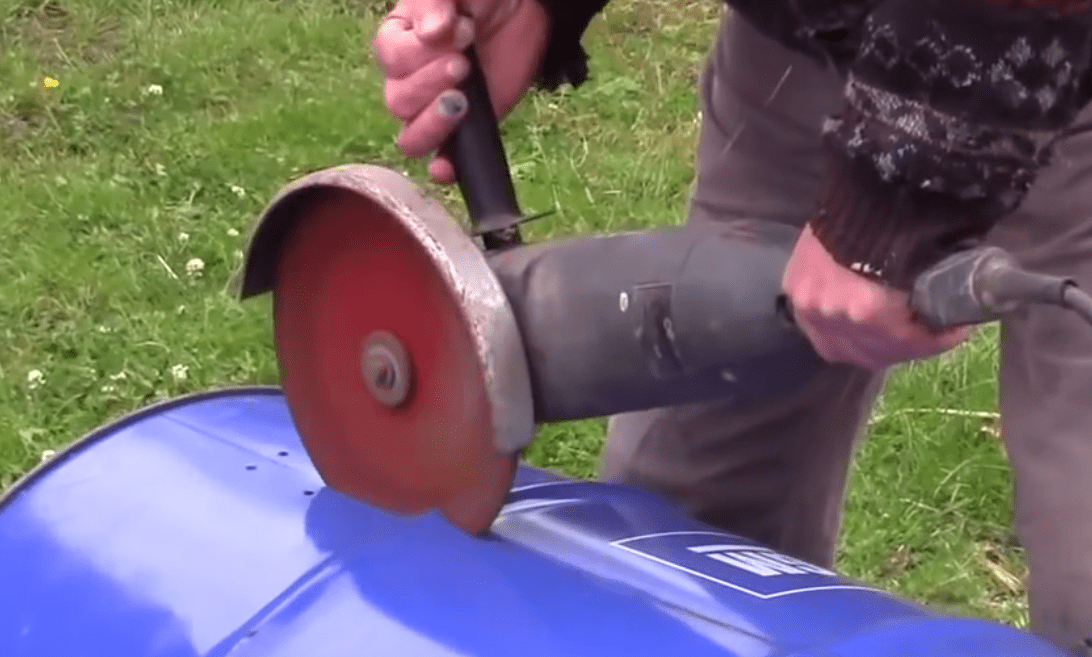 - Бочка разрезается пополам. Можно вырезать кусок стенки, который станет крышкой. Края следует обработать, чтобы обеспечить безопасность эксплуатации.