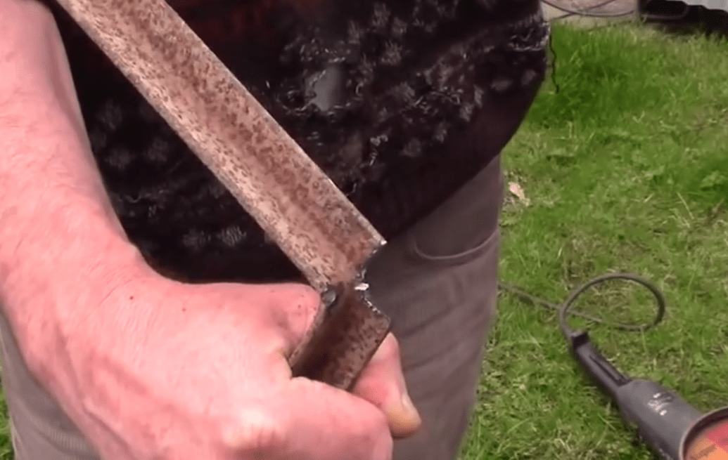 Теперь пришла пора сделать ножки для мангала из металла своими руками. Берем старый железный уголок и намечаем два отрезка по 170 см – это будут наши ножки, прикрепить которые мы сможем к бочке без использования сварочного аппарата.