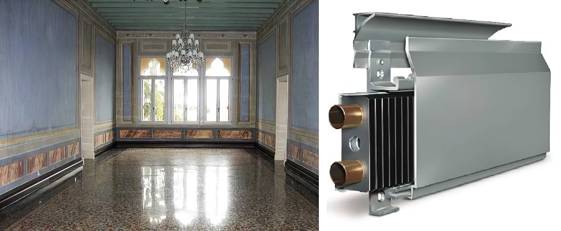 По форме плинтусное отопление напоминает пластинчатые радиаторы старого образца — это две трубы с большим количеством тонких пластин. Разница в том, что трубы эти тонкие, как правило — медные, имеют настолько небольшую высоту и ширину, что прячутся за высоким плинтусом специальной формы (открытым сверху). Благодаря высокому коэффициенту теплопередачи меди, мощность у этих небольших радиаторов высокая, набирается она благодаря длине — хоть по всему периметру комнаты.