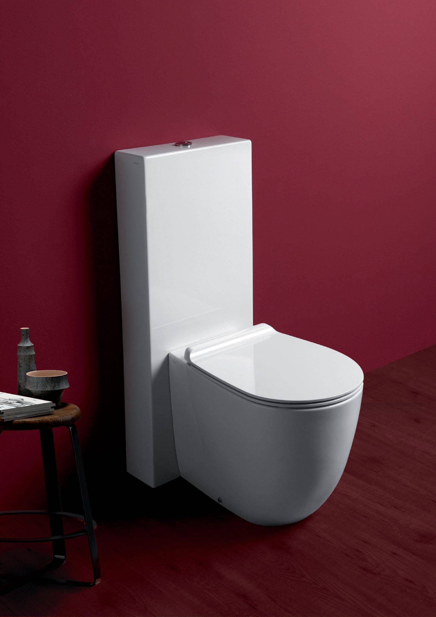 Напольный римфри-унитаз почти в точности повторяет стандартную модель. Сливной бачок устанавливается на задней полке. Дополнительно в комплект могут входить микролифт и биде. Стоимость такой конструкции немного ниже, чем приставной или подвесной. При выборе необходимо учитывать площадь санузла. Задняя полка напольного римлесс-унитаза занимает 15–30 см от пола и стены, поэтому такие модели не подходят для малогабаритных квартир. Если в санузле слишком тесно, стоит отдать предпочтение другим моделям.