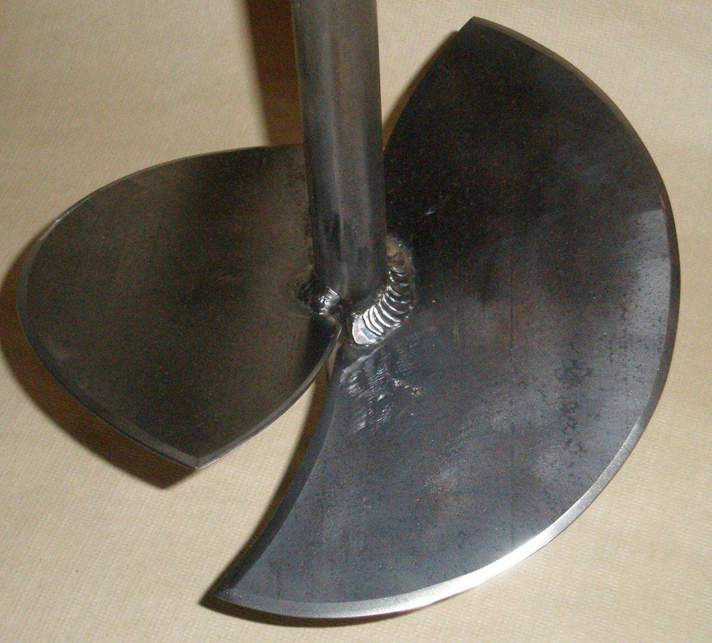 В изготовлении можно использовать половинки дисков, которые привариваются друг против друга. Имеющиеся режущие лезвия должны иметь хорошую заточку и закалку. При вращении вручную перпендикулярно штанге приваривается ручка из трубы.