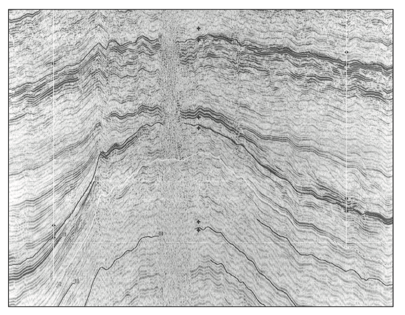 Анализ публикаций, посвященных вертикальной миграции УВ из глубинных источников генерации, показал, что в последние годы все большее развитие получает геосолитонная теория образования месторождений нефти и газа. Самой продвинутой в разработке геосолитонной концепции явилась группа тюменских ученых во главе с доктором геолого-минералогических наук Р.М. Бембелем. Согласно этой теории, формирование месторождений происходило (и происходит) за счет поступления УВ из недр Земли по геосолитонным трубкам, которые представляют собой субвертикальные узкие зоны, уходящие глубоко в фундамент. Предполагается, что это участки деструкций горных пород, возникших в результате многократно повторяющихся в течение длительного геологического времени геодинамических (геосолитонных) воздействий. Траектории геосолитонов образовали так называемые «столбы», которые мы видим на сейсмических разрезах в виде субвертикальных узких зон ослабления сейсмической записи. В качестве демонстрации классических геосолитонов, приведем временной сейсмический разрез через Мессояхское месторождение (рис. 7), на котором видны описанные зоны, наиболее выраженная из которых проходит через сводовую часть структуры.