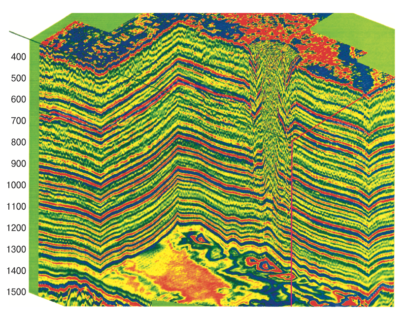 Рис. 8. Пулытьинское месторождение. Композиция горизонтального и вертикального сечения волнового поля по материалам 3D-сейсморазведки, проходящего через геосолитонную трубку