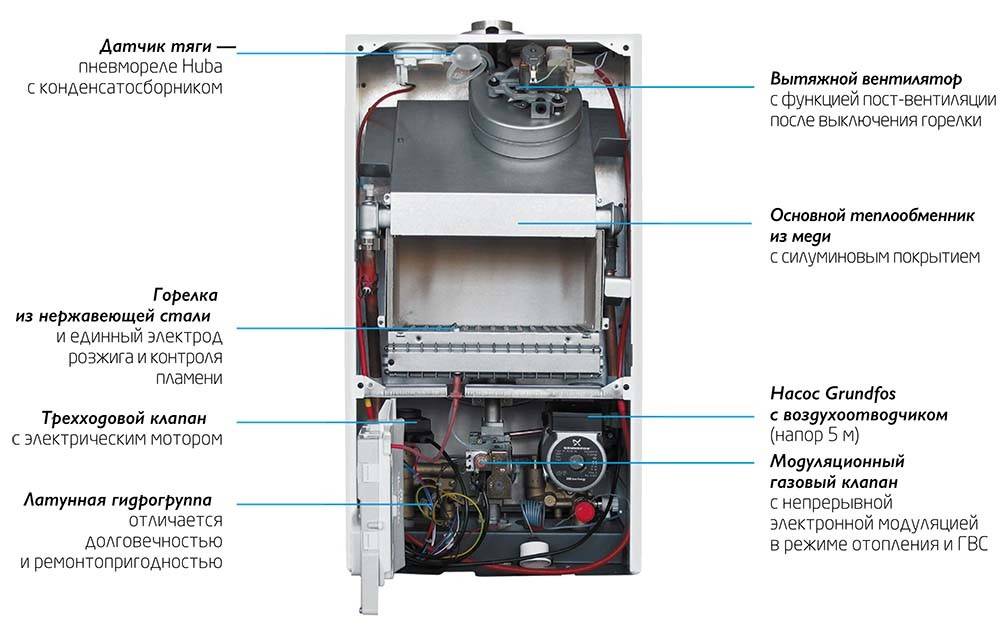В стандартной комплектации газовый котел турбо имеет несколько обязательных узлов, обеспечивающих его работу и безопасность, это: