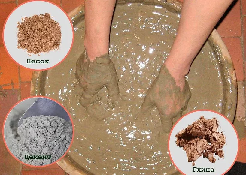 Замазка из глины и песка – самый доступный и недорогой вариант. Схема приготовления смеси: