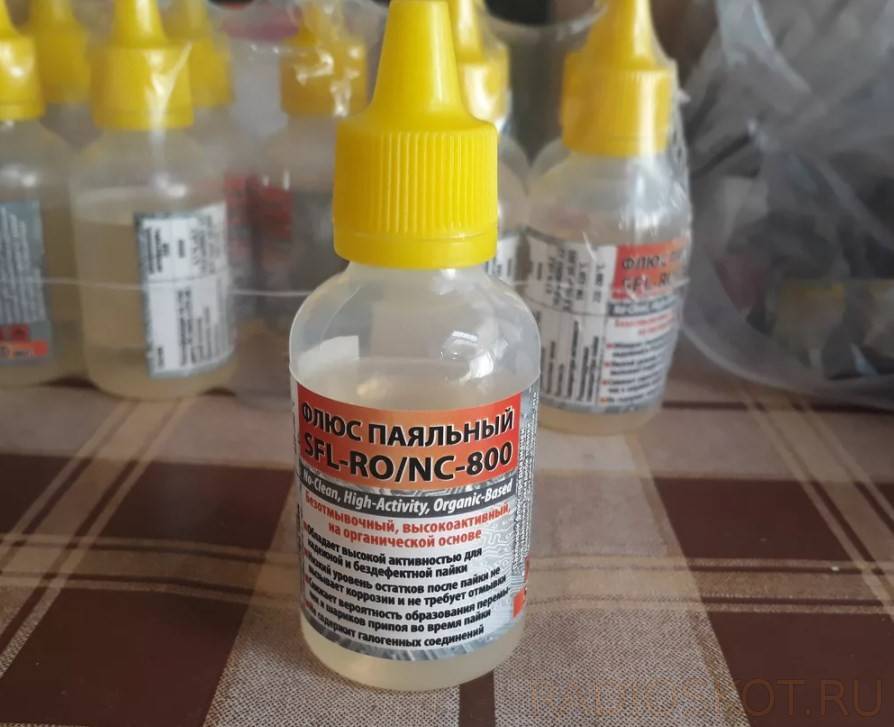 Флюс – упрощает пайку за счет удаления примесей с паяемой поверхности, облегчает плавление, увеличивает текучесть олова. Флюс, в отличие от канифоли, не оставляет коричневых следов, но остатки флюса необходимо удалить (например, ацетоном), поскольку они могут вызвать коррозию.