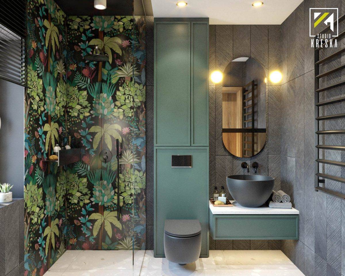 Соединение зон унитаза и умывальника — это темно-зеленые фасады шкафчиков: под умывальником и над унитазом. Это сказывается не только на визуальном восприятии интерьера, но и на большем количестве места для хранения вещей. Закрытые шкафы значительно упрощают поддержание порядка.