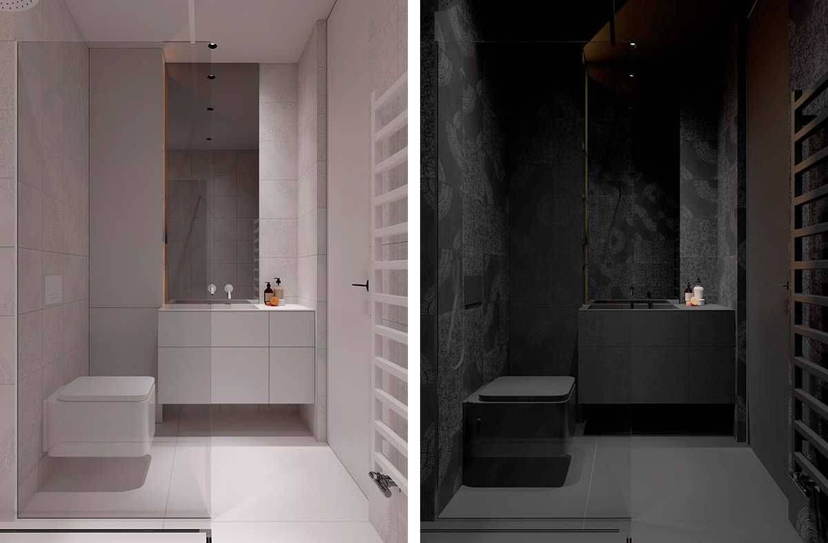 Часто при использовании монохрома в равных соотношениях возникает ощущение искусственности. Минимизировать эффект поможет метод непропорционального оформления. Один из цветов делают основным, второй – вспомогательным. В просторных пространствах доминирующим можно сделать черный, в компактных – только белый. Для ванных в «хрущевках» не рекомендуют применять более 15% темных оттенков.