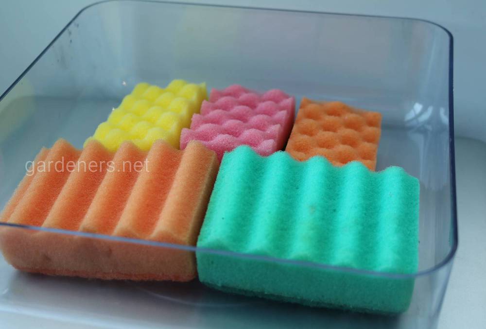 Как только губка поменяла цвет или начала неприятно пахнуть ее необходимо без сожаления выбросить. Прозрачные лотки для овощей и фруктов с перфорированным дном — хорошее решение для хранения поролоновых мочалок и других принадлежностей для мытья посуды.