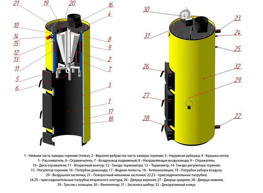 Кроме этого, разные модели полуавтоматических котлов работают по схеме с верхним или с нижним горением топлива.