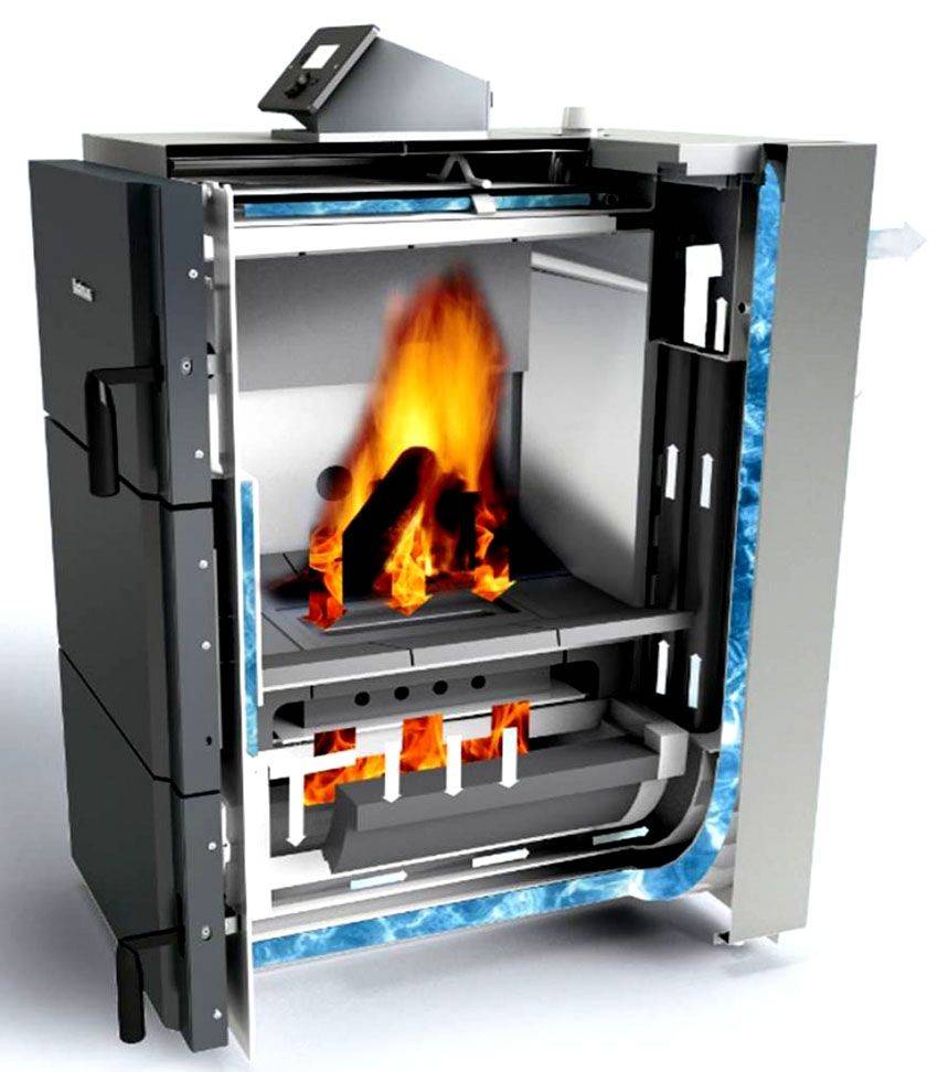 Топливо в котле перерабатывается по принципу верхнего горения, он заключается в том, что дрова начинают прогорать с верхнего слоя. Пламя постепенно опускается вниз, что существенно замедляет процесс тления топлива, но при этом увеличивает подачу тепла.В зависимости от модели, у котлов изменяется длительность работы от одной загрузки топлива. В среднем ее хватает на 1−2 суток непрерывного горения при поддержке постоянной температуры. Но есть и такие котлы, которые способны работать более 3-х суток без постороннего вмешательства.