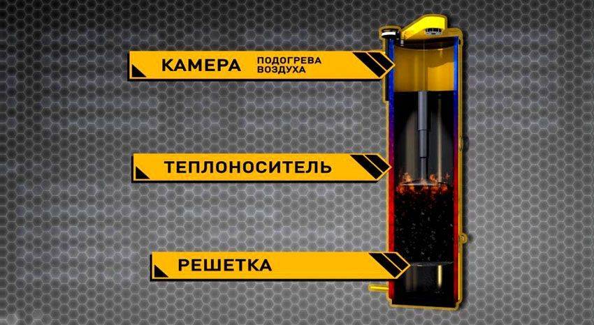Основу конструкции составляет топка, состоящая из портала для загрузки, колосников для организации воздухоподачи и зоны дымоотведения. Зола собирается в отдельную емкость. Для теплообмена предусмотрена водяная рубашка, в которой циркулирует жидкость. Терморегуляция и контроль нагрева выполняются заслонкой и шиберами.
