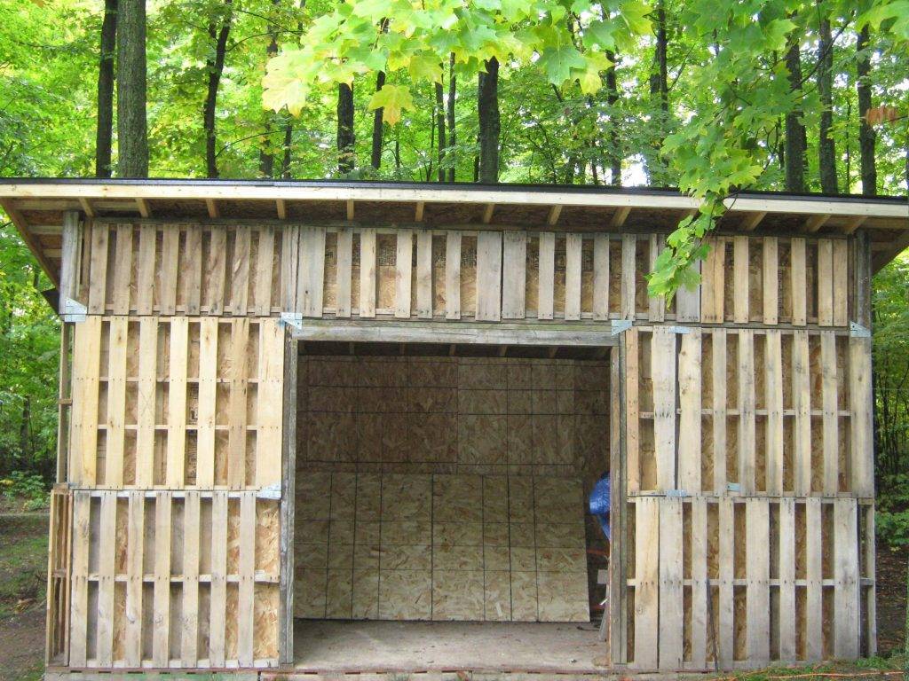 Важно! В закрытой разновидности дровника не забудьте отдельно укрепить дверной проем. Если вы не хотите тратить много времени и сил на строительство, используйте паллеты: