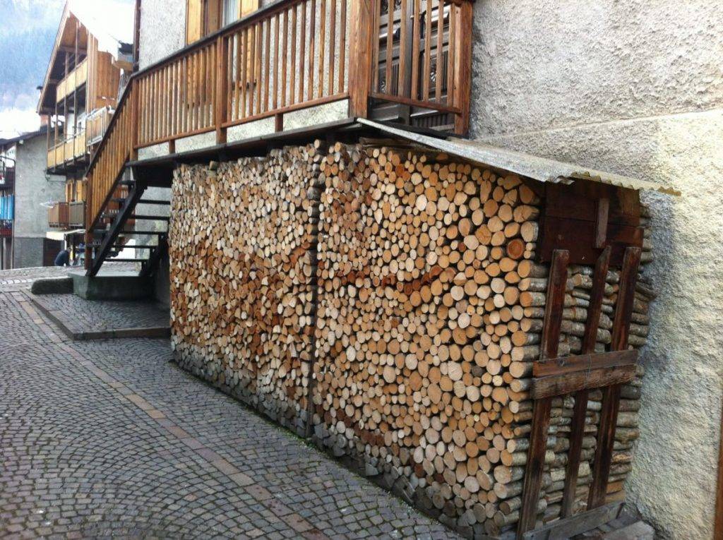 Дрова не должны контактировать с влажной землей или высокой травой, поэтому на улице их укладывают на непромокаемые основания. В пристенном исполнении необходима защита от осадков, стекающих с крыши дома непосредственно на поленницу.