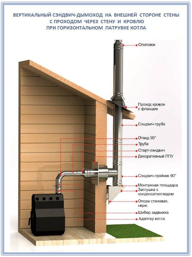 Сэндвич-труба отлично удерживает тепло и поэтому может быть смонтирована снаружи дома