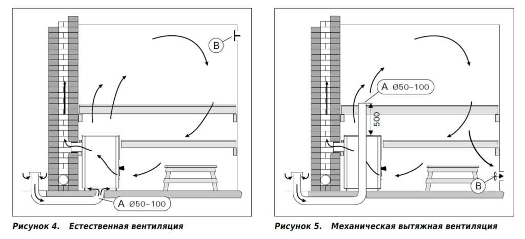 Приточное отверстие располагается позади печи на высоте 0,5 м от уровня каменки, а вытяжное отверстие – на противоположной стене от «входа» в самом низком положении по отношению к полу (на 0,2-0,3 м от нулевой отметки). Вытяжка отработанного воздуха выполняется принудительно, для этого в вытяжное отверстие вставляют вентилятор.
