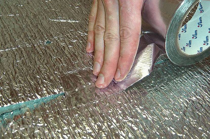 - Теплоотражающая изоляция укладывается встык, затем фиксируется; стыки проклеиваются.