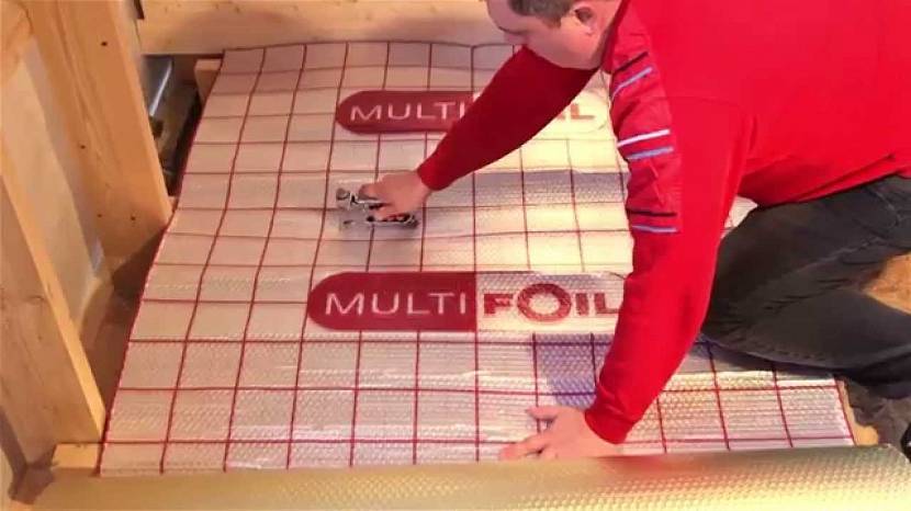 - Пол удобнее всего утеплять материалом на клеящем слое; в противном случае для фиксации понадобится алюминиевый скотч или строительный степлер.
