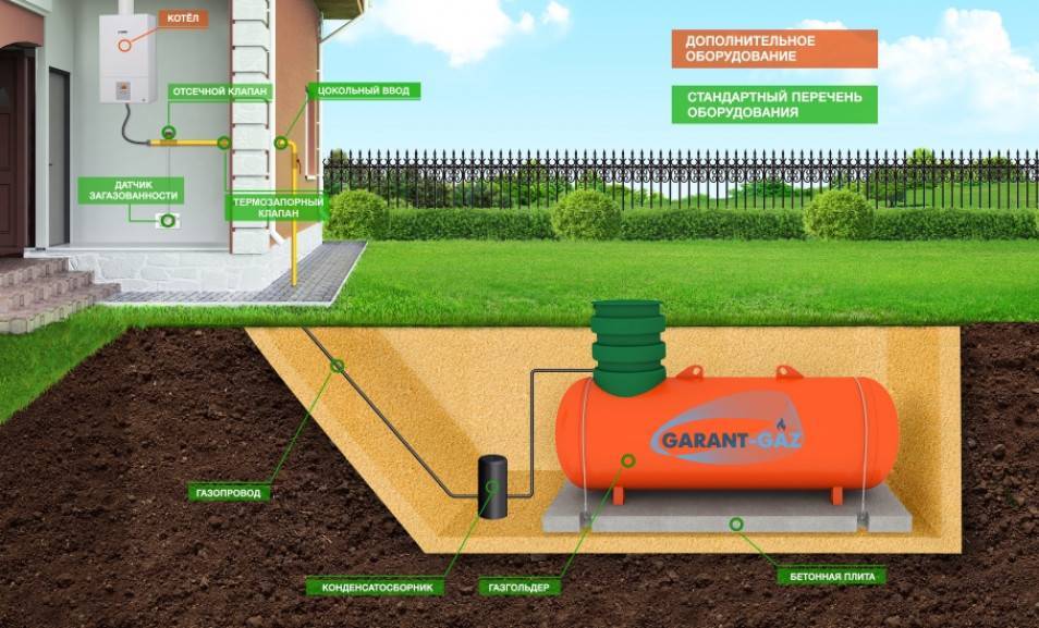 Схема работы системы довольно проста: в соответствии с нормами проектирования рядом с домом или любым другим объектом закапывают емкость (газгольдер) объемом 1 750 до 10 000 литров. На поверхности остается только горловина резервуара.