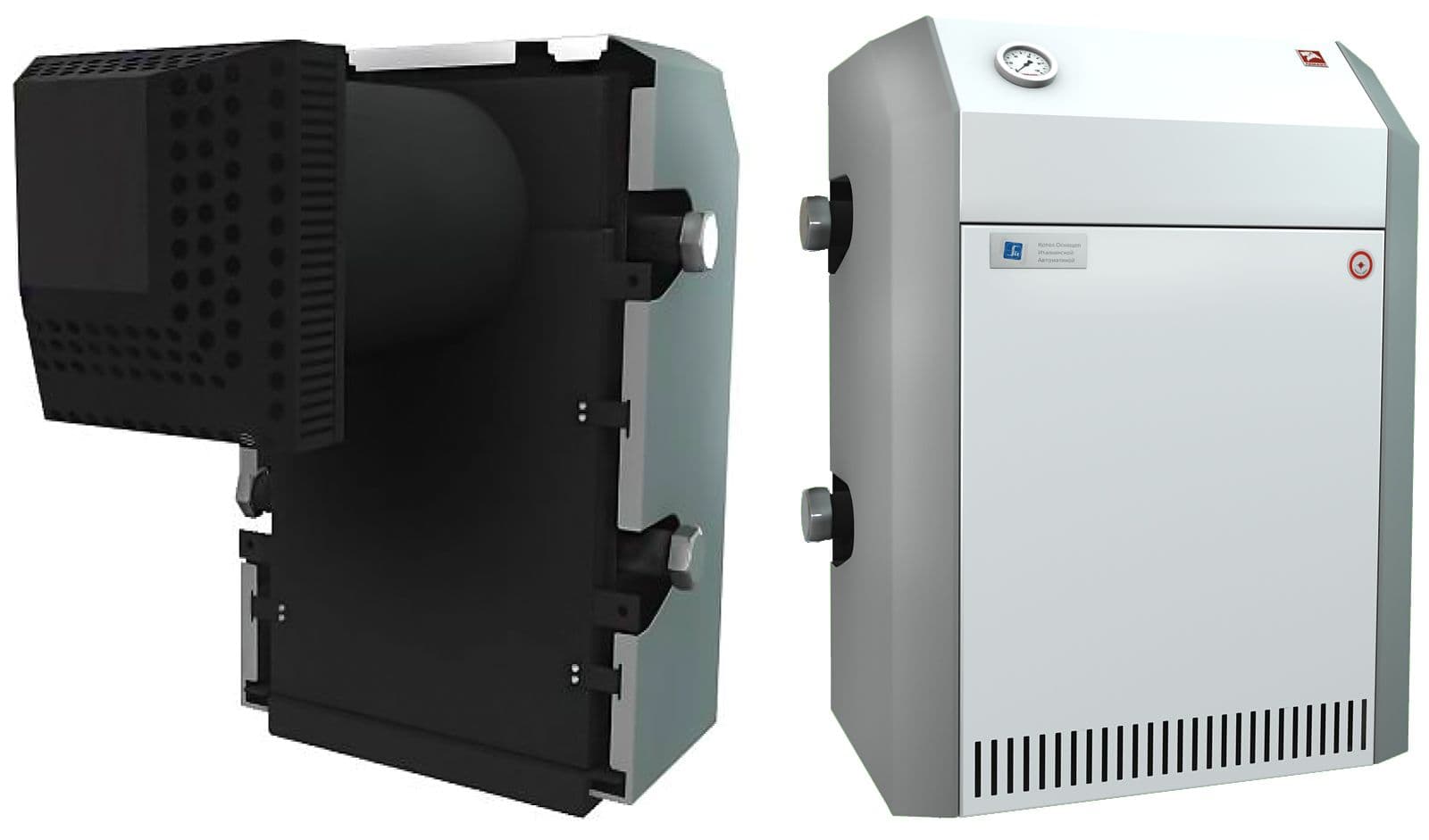 - теплоффективность выше, особенно если приобрести напольную модель (напольные газовые котлы для отопления дома). Напольные котлы изготавливаются из чугуна, он дольше держит тепло, чем сталь;