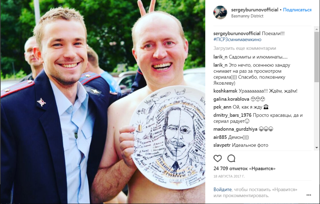 Но талантливый актер стал всеми любим и узнаваем только в 2016 году, когда сыграл подполковника полиции в комедийном сериале «Полицейский с Рублевки«. Именно роль Яковлева Владимира Сергеевича сделала Сергея Бурунова звездой телеэкранов. Его стали узнавать на улицах, приглашать в новые проекты. Его талант перевоплощаться в различные роли открыли новый виток в карьере. Далее он сыграл во всех сезонах сериала и будет продолжать в нем участвовать.