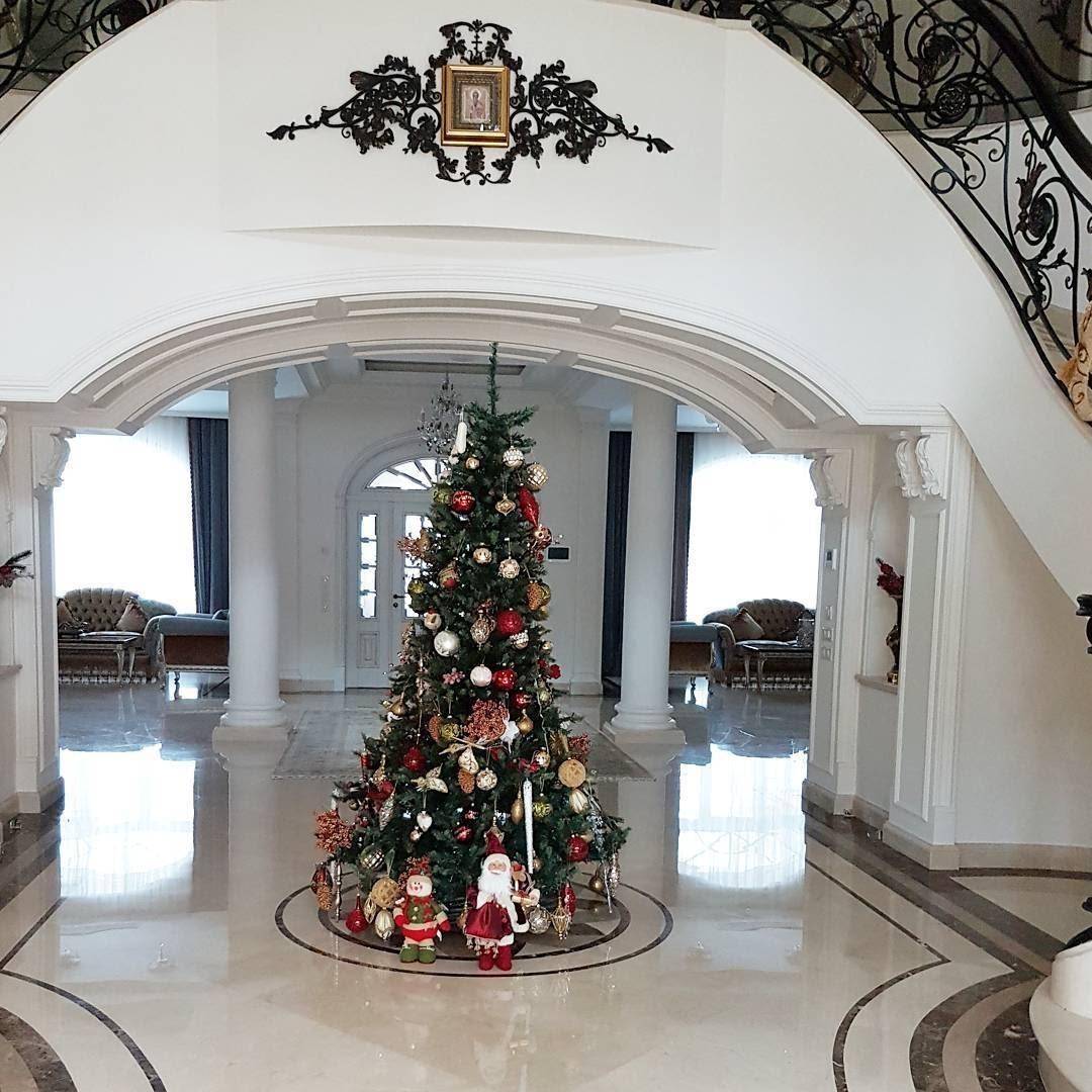 Общий интерьер дома выполнен в светлых тонах. Здесь очень ярко и просторно. Когда солнце не освещает помещение сквозь большие окна, в силу вступает искусственные источники в виде огромной люстры в холле, а также обилия всевозможных ламп, бра и даже свечей. В холле расположилась красивая лестница на второй этаж. Перила кованные, специально заказанные у русских мастеров. Лепниной же занимались приглашенные зарубежные профессионалы из Италии.