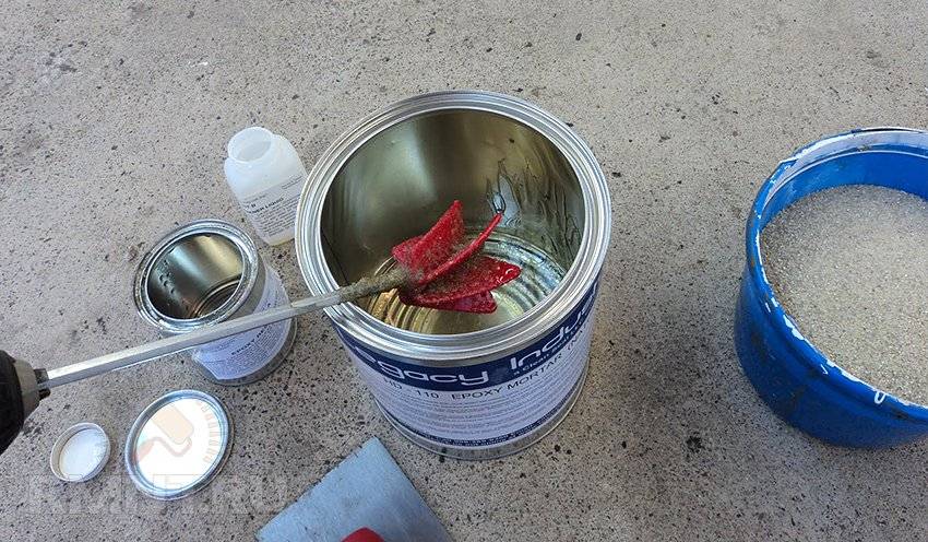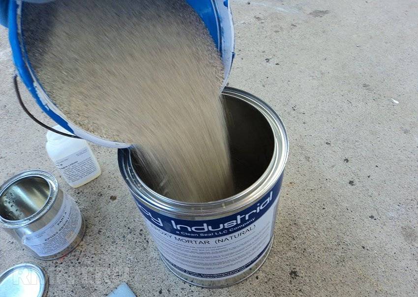 Описанный способ с применением песка хорош для сухих стяжек. При использовании под жидкую среду (воду) песок из состава исключается (в т. ч. присыпка). Возможность применения песка в составе фирменных ремонтных смесей комплектов (смола + отвердитель) указана в инструкции.