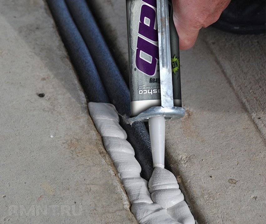 Если швы после очистки от грязи, мусора и отколовшегося бетона получились слишком глубокими и широкими, их затыкают джутовой, пеньковой или льняной веревкой, пропитанной специальным составом, подходящим для гидроизоляции.