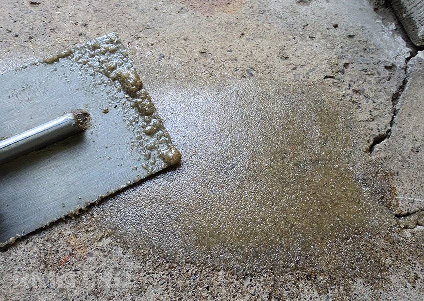 - Заполнить раствором трещины нужно при помощи кельмы, а потом необходимо намочить ремонтные места. Подобные действия с водой не нужны, если вы применяете не раствор, а полимерный состав.