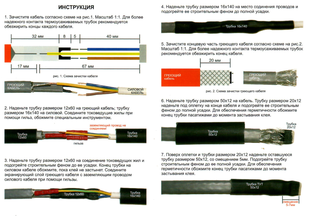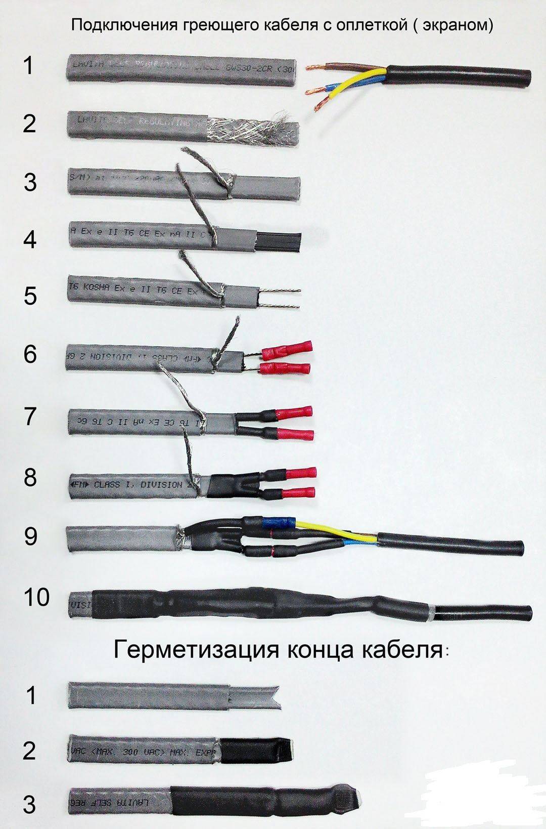 Сначала необходимо свободный конец нагревателя освободить от изоляции. Изоляционный экран следует скрутить в пучок и произвести зачистку жил проводника. Жилы и силовой кабель соединяются. Поверх места соединения фиксируется термоусадка.