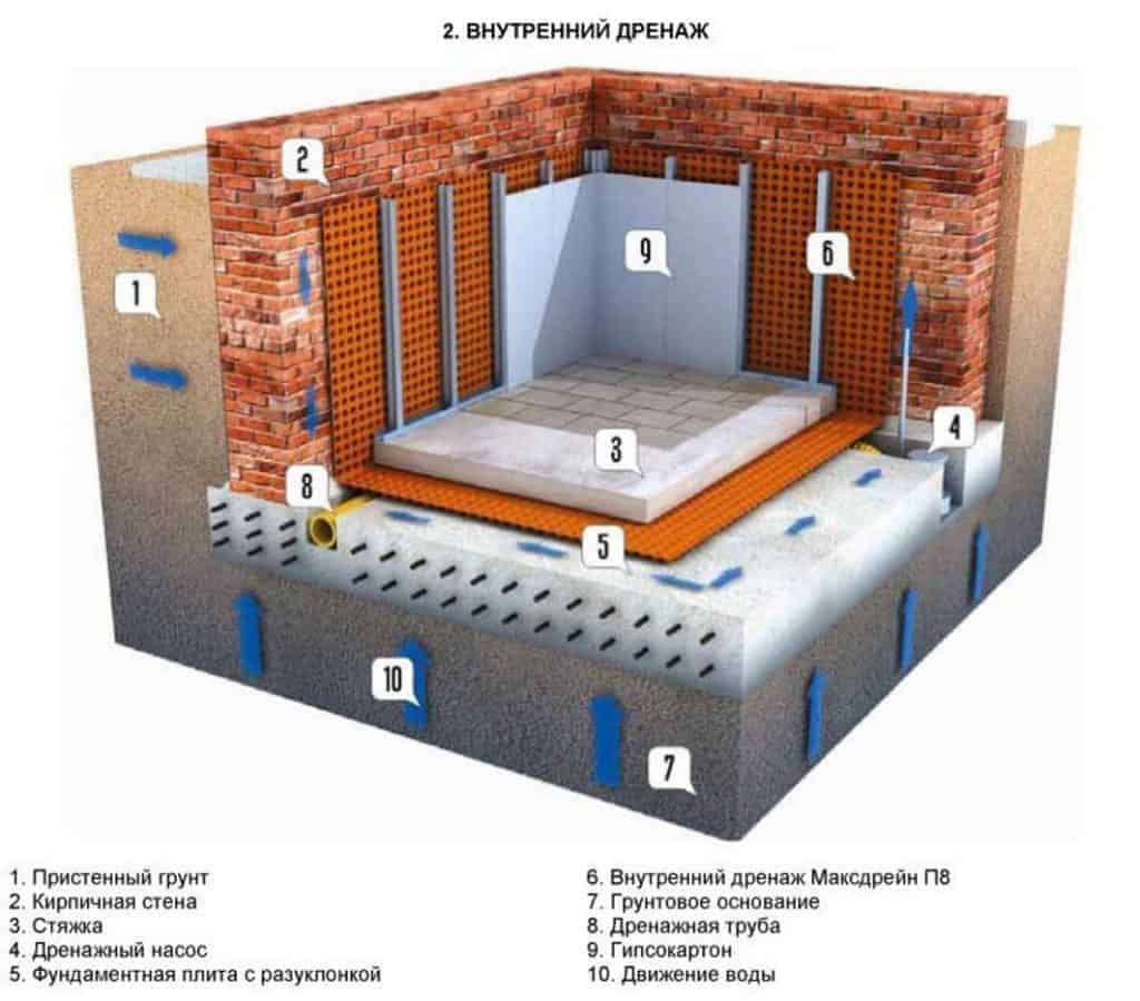 Перед тем, как избавится от грунтовых вод в подвале, его гидроизоляцию и защиту следует провести по такой технологической цепочке. Пять первых пунктов выполняются аналогично предыдущему параграфу.