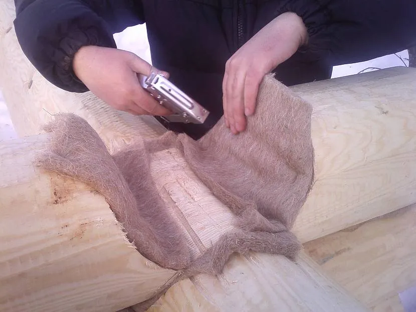 Льноватин укладывается между бревен или брусьев. Если толщины не достаточно, что полосы можно монтировать в два слоя, закрепляя их при помощи скоб
