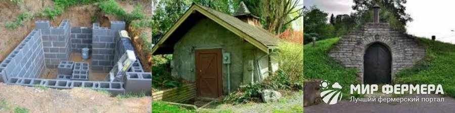 Рисунок 1. Основные виды погребов (слева направо): подземный, наземный и полузаглубленный