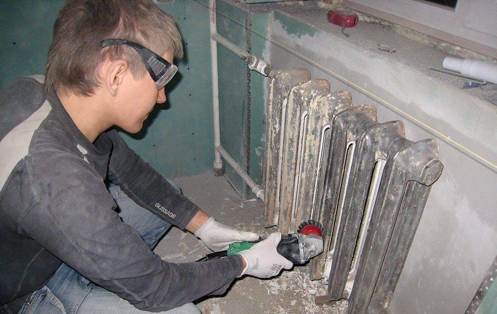 Демонтаж старого радиатора | Проводим демонтаж старой батареи. С помощью болгарки аккуратно отсоединяем чугунную конструкцию, убедившись перед этим, что вся система отключена, и остатки воды из труб слиты. |
