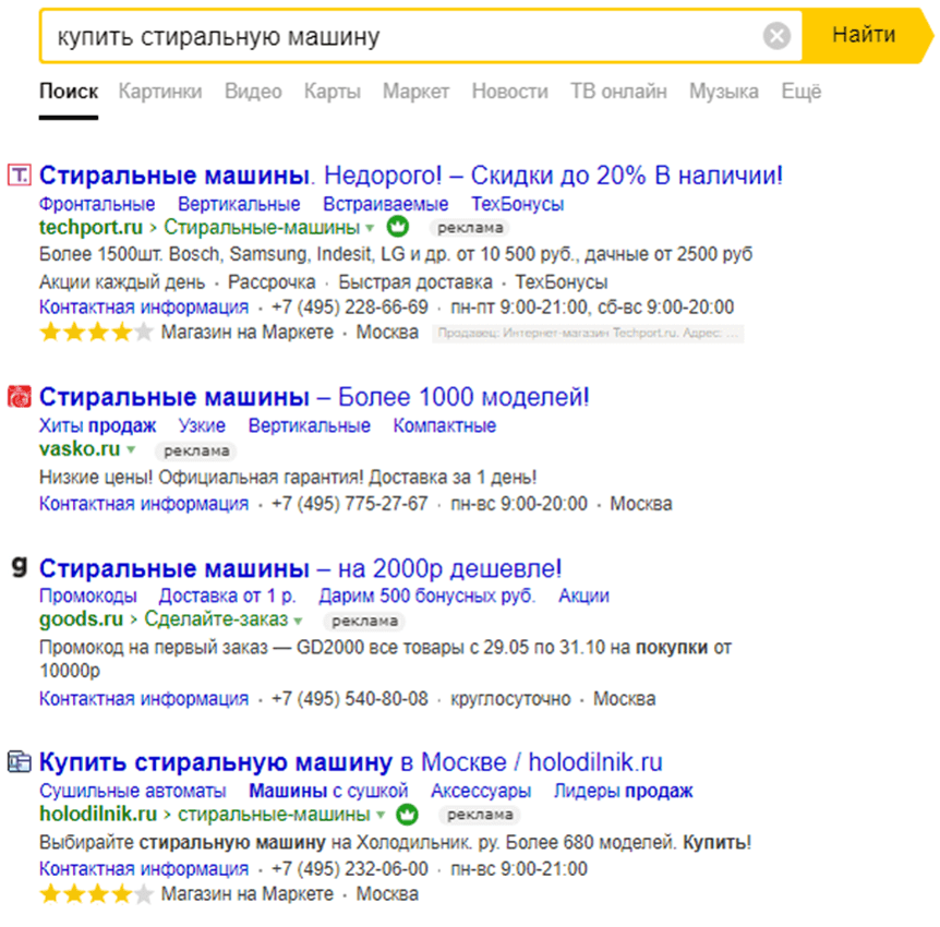 Во-первых, из-за большого количества рекламных объявлений органическая выдача спускается на второй экран. По некоторым особо популярным запросам можно встретить до 5 рекламных позиций в выдаче. По менее конкурентным запросам их чуть меньше.