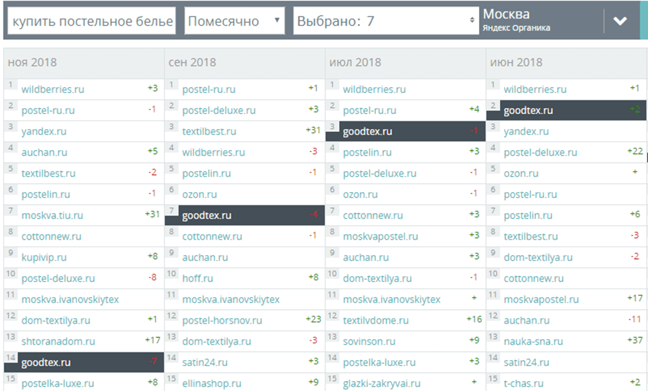 Обратите внимание на запрос «купить постельное белье» на скриншоте – сайт был на втором месте и скатился на 14-е. Какое количество трафика он потерял, можно только догадываться