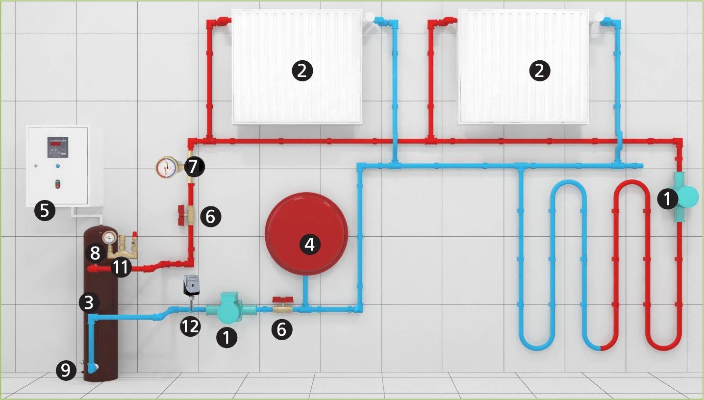 Попутная схема отопления с электрическим котлом работает по следующему принципу: