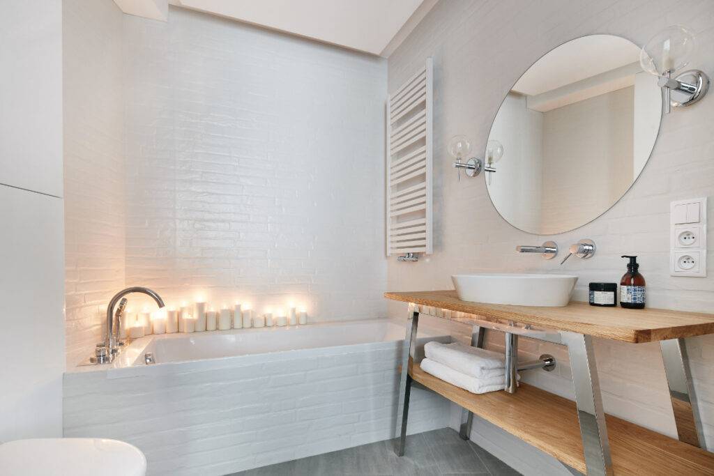 - Теплый или холодный свет). Выбрав теплый свет, вы получите желтый оттенок, благоприятный для расслабления. Однако рядом с зеркалом стоит установить прохладный белый свет, имитирующий дневной, что облегчит выполнение основных действий, таких как макияж или бритье.