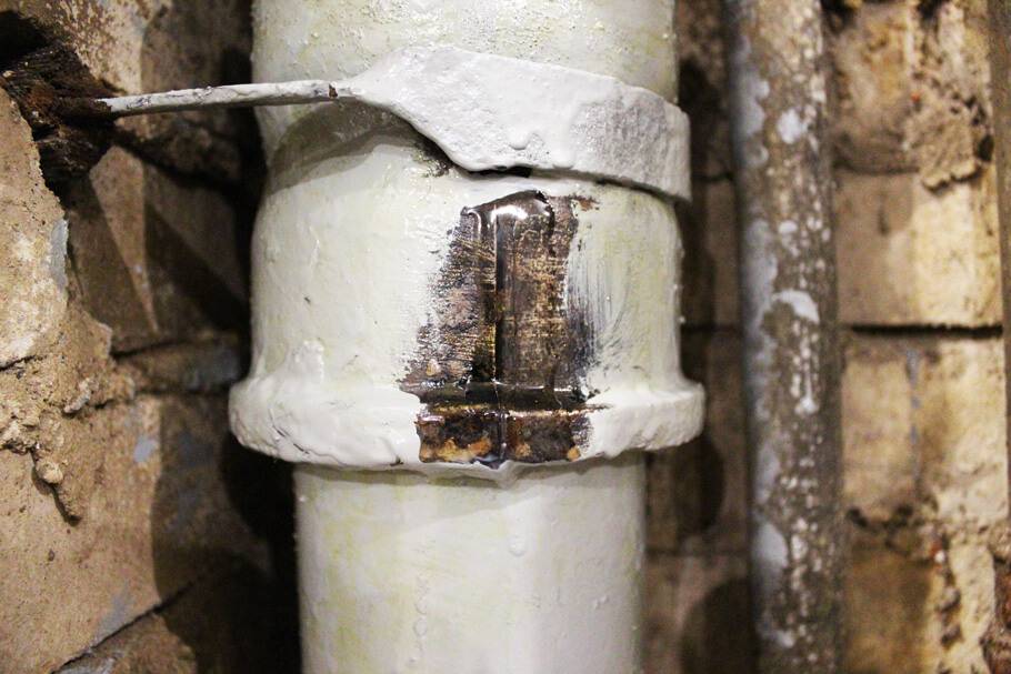 Иногда течь возникает не в шве, а в самих трубах. Это может произойти из-за производственного брака, например, микротрещины или локальной неоднородности материала. Неаккуратная эксплуатация, механические повреждения, соединение заземления от бытовых приборов к чугунным трубам – все это может привести к поломке. Незначительную трещину может устранить хомут или специальные изоляционные пленки. При больших дефектах потребуется замена целого участка.