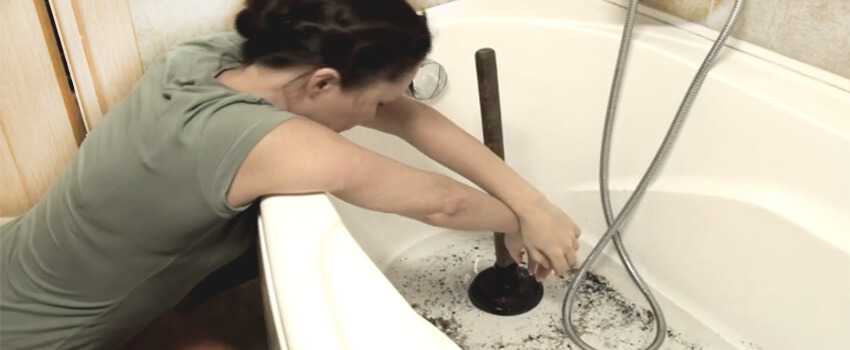 Удалить засор в ванне в домашних условиях несколько сложнее, чем в раковине – трудно подобраться снизу и разобрать конструкцию. Поэтому быстрее и практичнее будет использовать народные средства, подробное их описание читайте выше.