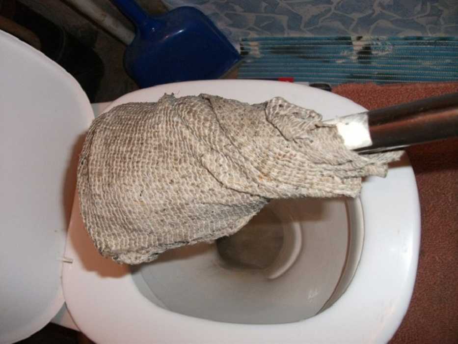 - В унитазе беда может случиться из-за попадания в него некоторых средств гигиены, ваты, бумаги, половой тряпки и других нежелательных вещей, засоряющих трубу.