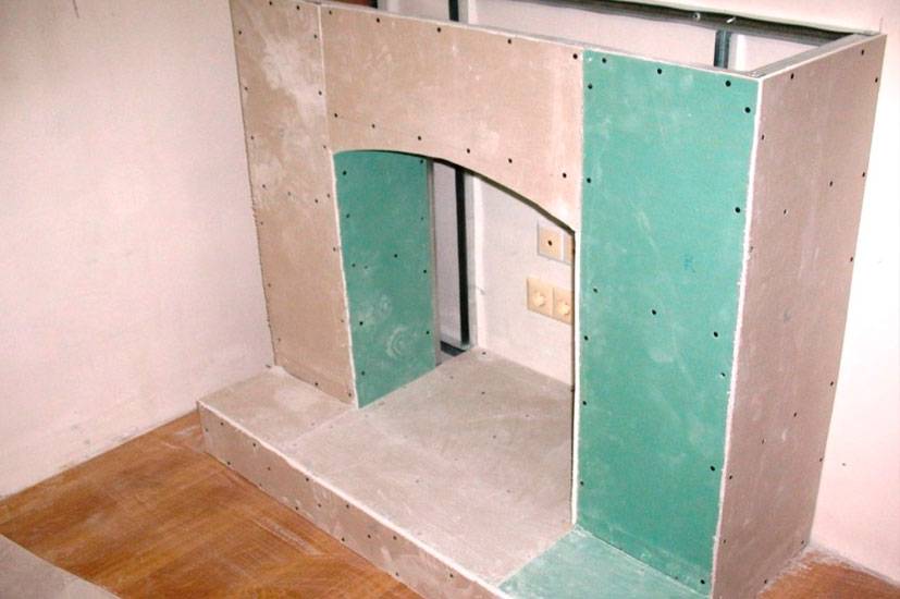 Когда планируется оформить конструкцию кафельной плиткой, то понадобятся зеленые (влагостойкие) листы, которые на порядок дороже. Материал позволяет построить стационарную декоративную конструкцию, в которую можно установить электрический обогреватель. Но более распространенным решением выступает фальшивый камин с ложным дымоходом, в нише которого устанавливают телевизионную панель.
