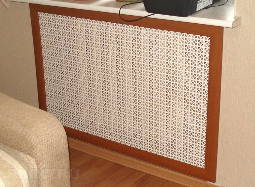 То же самое следует сказать о таком материале, как ламинированные панели МДФ. Они легко поддаются обработке, прочны и долговечны, а наружный рисунок можно удачно подобрать под интерьер комнаты. Еще одно преимущество — экраны из МДФ не требуют ухода, как деревянные. Стоимость материала достаточно демократична, поэтому изделия из дерева и МДФ – это наиболее распространенные варианты для облагораживания отопительных приборов.