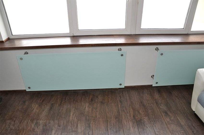 В отдельный вид можно выделить декоративные экраны из стекла. Это единственный вид материала, который используют в чистом листовом виде, без устройства отверстий. А чтобы не нарушить конвекцию, панель устанавливают без верхней и боковых стенок. Монтаж происходит с помощью специальных креплений на несущие элементы из холоднокатаной декоративной трубы, которые обеспечивают необходимый вентиляционный зазор между батареей и панелью.