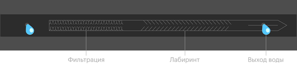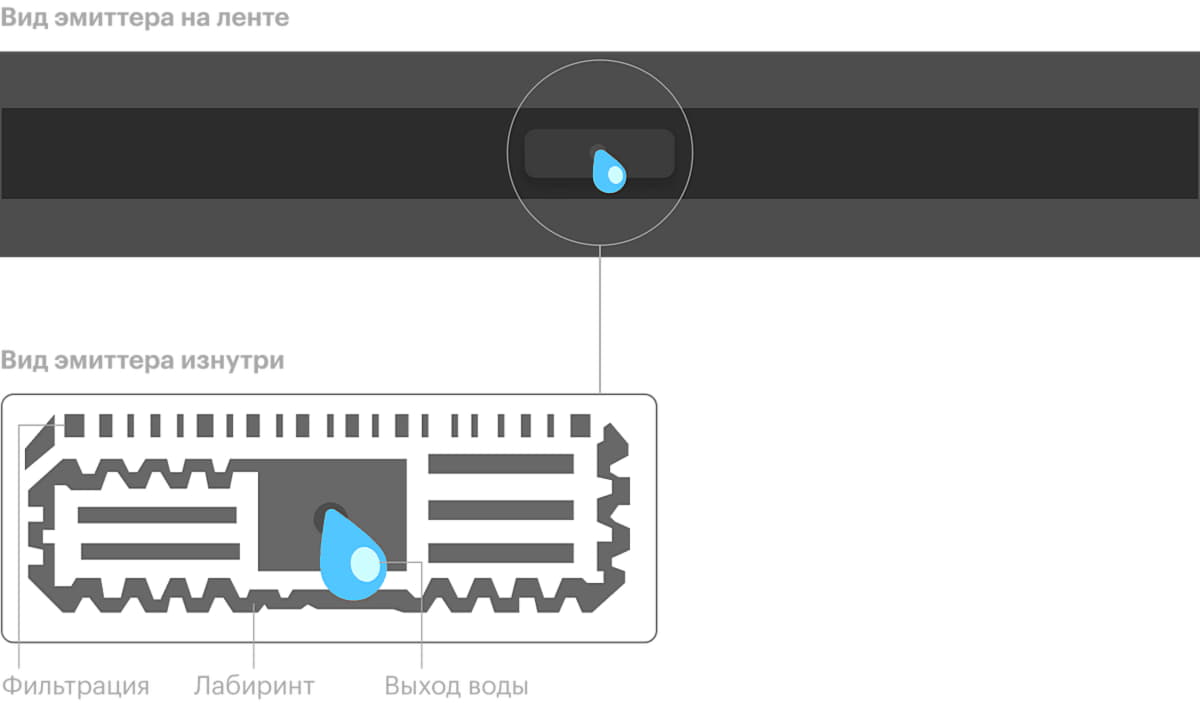 Эмиттер устроен по принципу лабиринта для воды. Она попадает в сеть запутанных микроканалов — это обеспечивает равномерность полива и меньшую зависимость от давления, чем если бы вода выливалась просто в щели на шланге