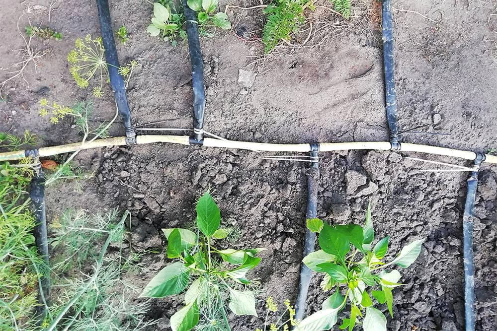 Количество лент на грядке зависит и от того, какие растения на ней посажены. Чем ближе друг к другу они растут, тем больше должно быть капельных лент. На большинстве моих грядок по три ряда растений — помидоров, огурцов, баклажанов, перцев, — поэтому я разложила под каждым по капельной ленте. Морковь и лук растут в шесть рядков, и три капельные ленты разложены через ряд.